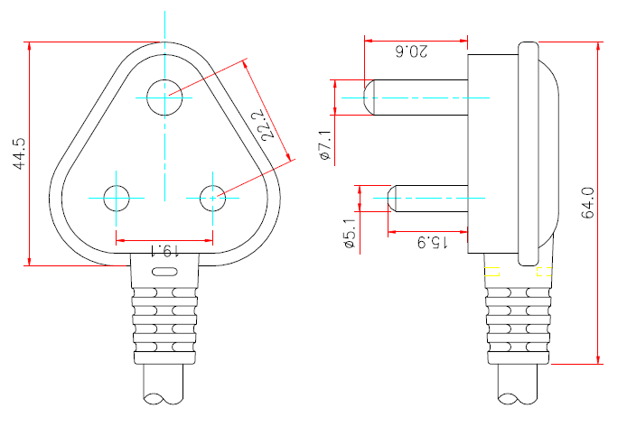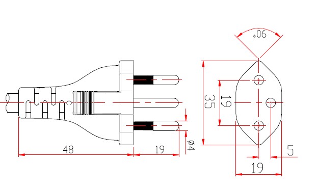 J型插頭有兩個圓形引腳和一個接地引腳。儘管J型插頭看起來很像巴西N型插頭,但它與N型插座不兼容,因為接地插針遠離中心線而不是N型插頭。但是,C型插頭與J型插座完全兼容。